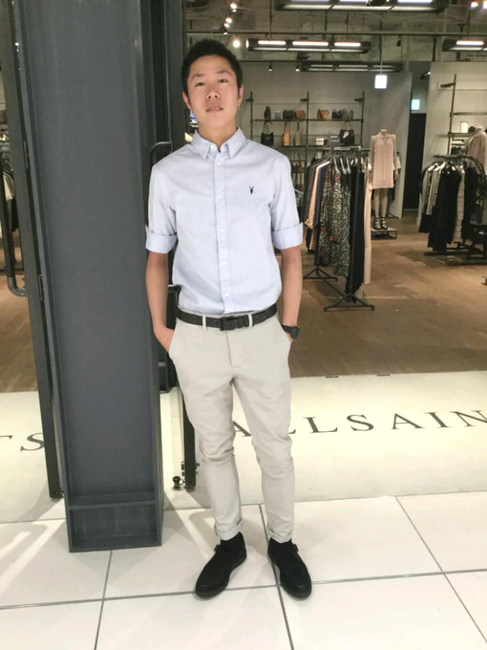 男性の場合、シャツ着用必須だと考えてOKです。全体的に明るめのアイテムを使用していますが、小物(ベルト・靴)を黒で統一しているためカジュアル過ぎず、上品にまとまっています。