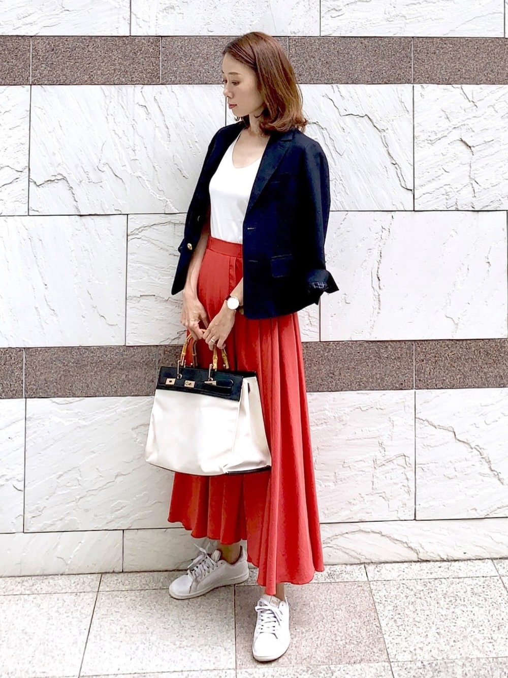 いつものオフィスカジュアルにスニーカーを合わせるのもアリです。