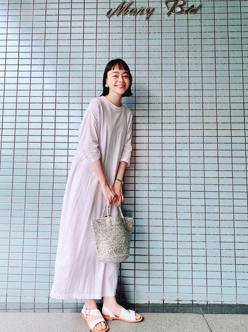 白のワンピースに白のサンダルも、清潔感溢れ涼しげです。