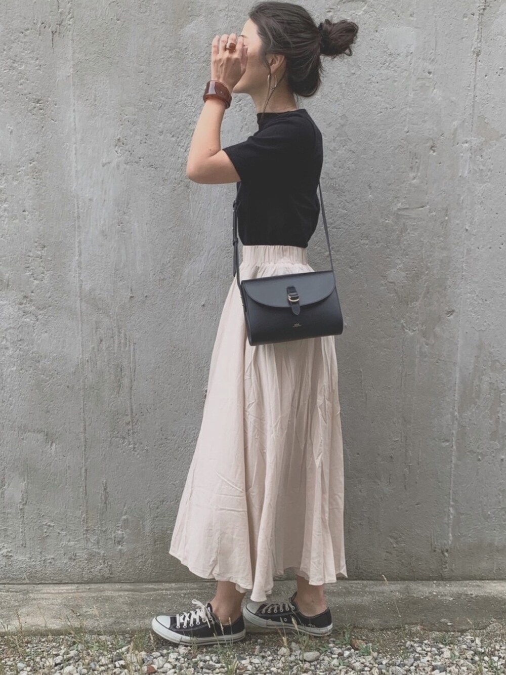黒でワントーンコーディネートにすることで、スタイリッシュに大人っぽくできます。